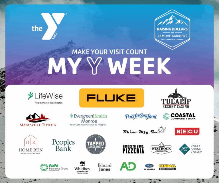 This year’s My Y Week partners, Fluke Corporation, LifeWise Health Plan of Washington, Evergreen Health Monroe, Tulalip Resort Casino, Home Run Design + Remodel, People’s Bank, Marysville Toyota, Tapped Public House, Pacific Seafood, Coastal Community Bank, Rhino MFG, Inc., WestRock Construction, Puget Sound Energy, BECU, and Brooklyn Bros. Pizza, share in the Y’s mission of creating a healthy, connected community for all, regardless of an individual’s ability to pay.